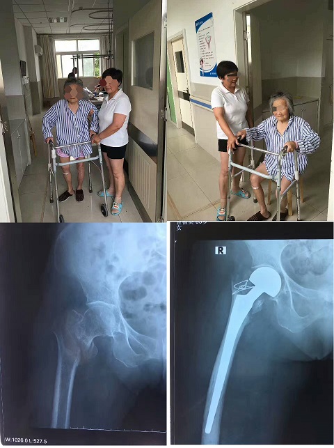 家住六安市裕安区的曹老人今年85岁了。(身份证年龄95岁)四月前右髋部摔伤臥床至今。来中山医院诊断“右股骨粗隆间陈骨折”收住。高 龄股骨粗隆间陈骨折的治疗一直为骨科界的难题。采用何种治疗方法在医学界尚有争议。中山医院骨科的医师们术前对老人的全身状况进行了综合评估,決定一起行加长人工半髋置换。其手术风险较大,但对病人有利。在征得家属同意后手术。手术后五天,病人已下地活动,老人恢复的不错,精神状态很好。