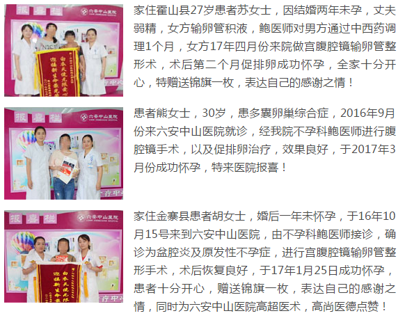 六安中山医院检查结果精准,快速出报告检查更全面引进多种先进的检查不孕不育的设备,可进行全面系统的检查。结果更精准由经验丰富的检验科医师操作,高科技的设备,保证了结果的精确可靠。快速出报告现代化的设备系统的读取报告,打印报告单,无需耽误更长时间。科学地分析由多年经验的不孕不育医师进行深入的讲解报告,并制定科学的治疗方案六安中山医院让无数家庭成功怀孕,许多成功怀孕的患者都送来锦旗前来报喜。