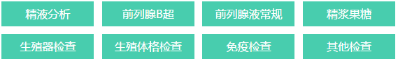 注意:以上检查项目可根据自己的实际需求进行选择。男方检查项目:男性不育的最大原因是精液问题,以下项目经过精液分析检查,可以对精子成活率、数量、液化时间、活动力、畸形率等多个方面进行综合分析,查出不育真因。
